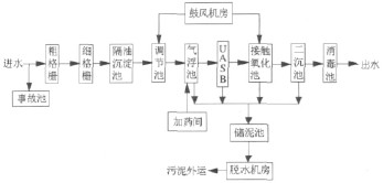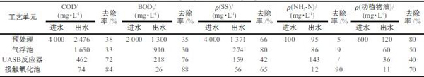 廢水**先經過粗細兩道格柵,粗格柵設在進水口處,以去除廢水中較大漂浮物,細格柵設置在提升泵房后,用以攔截廢水中的碎毛發和部分懸浮物,格柵出水經提升泵提升進入平流隔油沉淀池,一方面可以除掉漂浮的油脂、油塊,另一方面又可以使大部分不溶于水、密度大于水的雜質沉淀下來。沉淀池出水自流進入曝氣調節池內,調節水量,通過曝氣充分混合均勻水質,同時進行預曝氣。廢水隨后進入氣浮池內,通過投加適當的藥劑混凝和加壓溶氣氣浮,使水中的分散油、溶解油及其他部分雜質、SS 得到很好的去除。氣浮池出水進入UASB 厭氧池進行生化處理,通過微生物作用將復雜的有機大分子物質降解為簡單的有機物。廢水經UASB 后自流進入接觸氧化池,有效去除COD 和NH3-N。氣浮池、UASB 厭氧池、接觸氧化池剩余污泥進入儲泥池濃縮后,在污泥脫水車間用帶式濃縮脫水一體機進行壓濾脫水,干污泥定期外運處置,儲泥池上清液和壓濾液回流到廠區污水系統進行再處理。