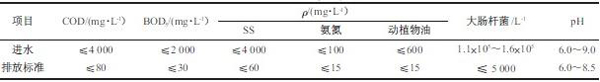 廢水產生有明顯的不連續性,每個季節以及每天的不同時段都不相同,節假日產生量較大,廢水中含有大量的血污、骨屑、肉屑、內臟、腸容物以及糞便等污染物,固體懸浮物含量較高,有機物濃度高,油脂含量大,廢水呈紅褐色并有腥臭味,屬于較典型的有機污水,可生化性好。廢水處理設計**大進水量為6 000 m3/d,平均水量為250 m3/h。處理后達到肉類加工工業水污染物排放標準(GB 13457-92)中畜類屠宰加工一級排放標準。具體進水水質及排放標準如表1 所示。